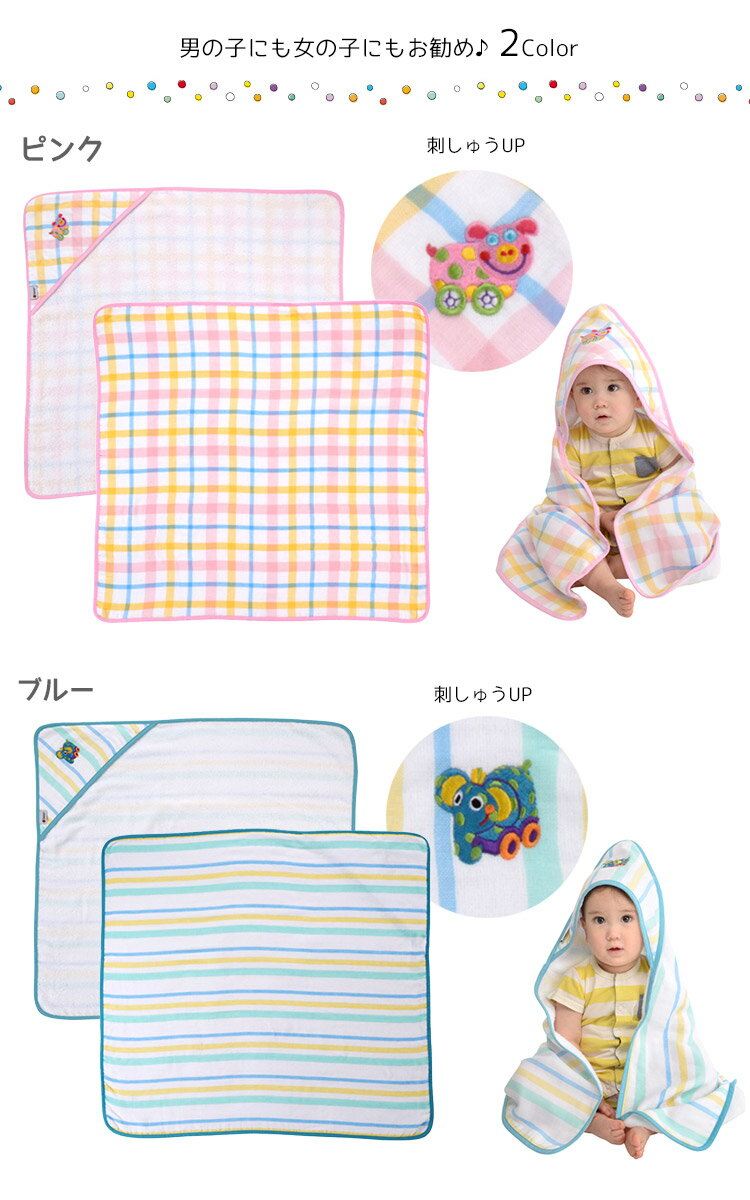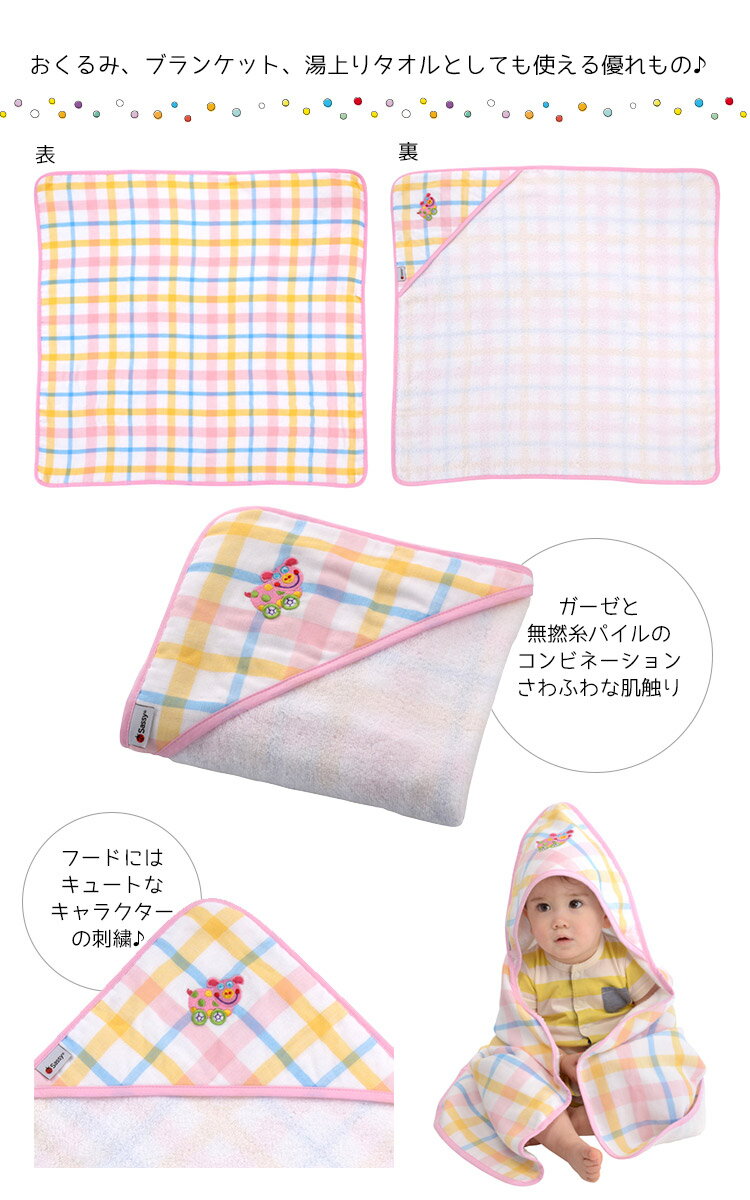 角にキャラクターの刺繍されたフードがついた、ついたキュートなおくるみ!ベビーにも安心の綿100%素材はガーゼと無撚糸パイルのコンビネーション。