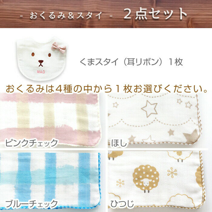【内容品】 名入れおくるみ1枚 名入れリボン付きスタイ(うさぎ・くま) 【サイズと素材】 <おくるみ> 約70cm×70cm 生地:綿100% <スタイ> 首周り:約31cm スタイ部分縦:約15cm スタイ部分横:約20cm 生地:綿100% バイアス:ポリエステル65% 綿35% スナップ:ポリエステル 吸水速乾性に優れ、肌触りの良い無撚糸のパイルガーゼを使用したスタイです。
